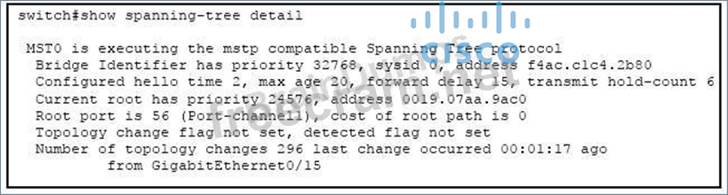 Refer to the exhibit. Which two statements are true about the displayed STP state? (Choose two.)
