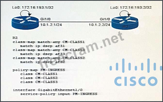 Refer to the exhibit. If router R1 sends traffic marked with IP precedence 3 to R2's Loopback 0 address, which class would the traffic match on R2's Gi1/0 interface?