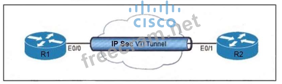 Refer to the exhibit. When packets are transmitted from R1 to R2, where are they encrypted?