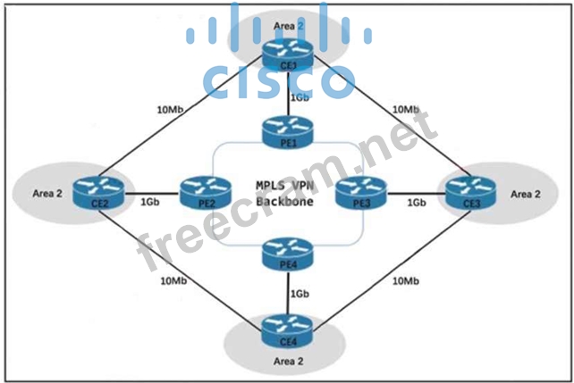 Refer to the exhibit. Your network uses an MPLS VPN backbone with OSPF between all PE and CE routers and on the 10Mb backup links between the CE routers. You notice that traffic from CE3 to CE2 and CE4 is flowing over the backup links instead of the higher-bandwidth MPLS VPN backbone even when the backbone is up. What change can you make to ensure that traffic uses the MPLS VPN backbone instead?