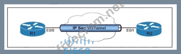 Refer to the exhibit. When packets are transmitted from R1 to R2, where are they encrypted?