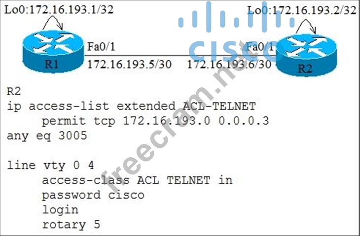 Refer to the exhibit. Provided that routing is configured correctly, what command can a user on R1 enter to telnet to R2?
