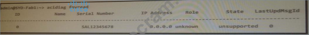 An admin wants to bring online a new leaf node into their ACI fabric. Before registering the leaf node, the admin checks the current status arid sees this output.