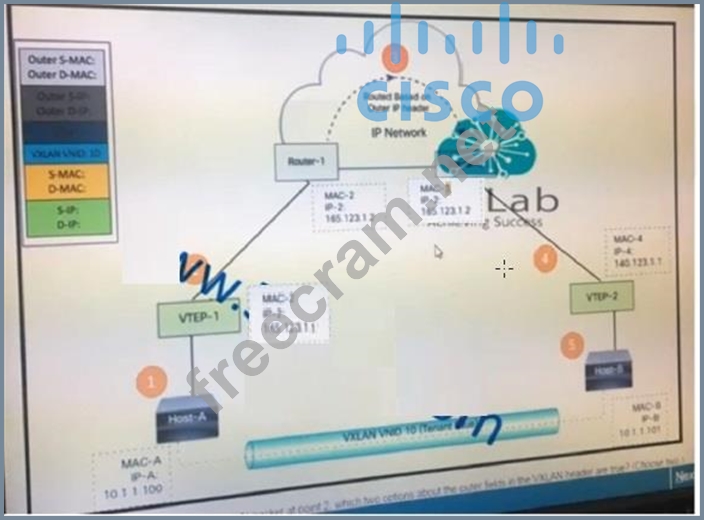 If you inspect a VXLAN packet at point 2, which two options about the outer fields in the VXLAN header are true? (Choose 2)