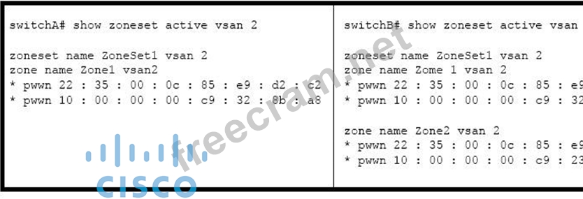 Refer to the exhibit. SwitchA and switchB have these zonesets currently active and are connected by an ISL that is configured to transport VSAN 2. Enhanced zoning is configured for VSAN 2, and merge-control is set to restrict. Which statement about this configuration is true?