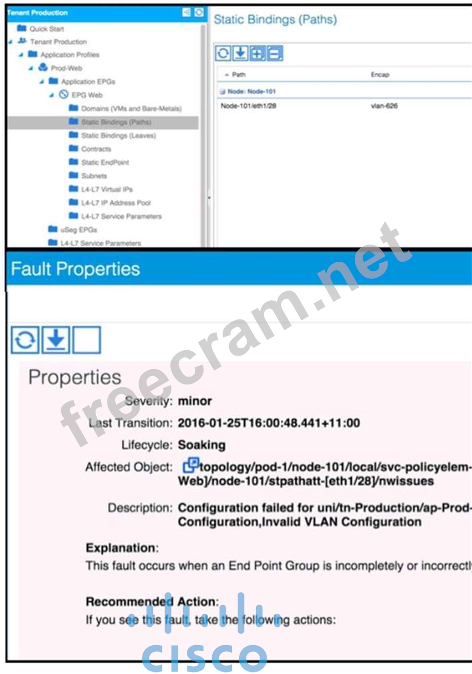 An admin has created a new EPG in an ACI fabric. The admin then specified static path binding as shown in exhibit. After submitting this policy configuration, the admin noticed that this newly created EPG had the fault shown in the exhibit. Which option is the likely explanation of this fault?