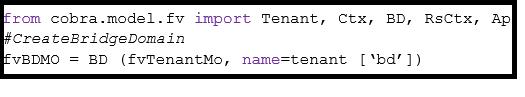 Refer to the exhibit. This cobra code extract is expected to create a BD object. Assume that fvTenantmo has been populated with the correct tenant object and all module prerequisites have been met. Which statement is true?