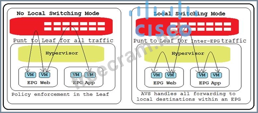 Refer to the exhibit. Which two types of encapsulations can be used in each switching mode, when utilizing the Cisco Application Virtual Switch in ACI fabric? (Choose two.)
