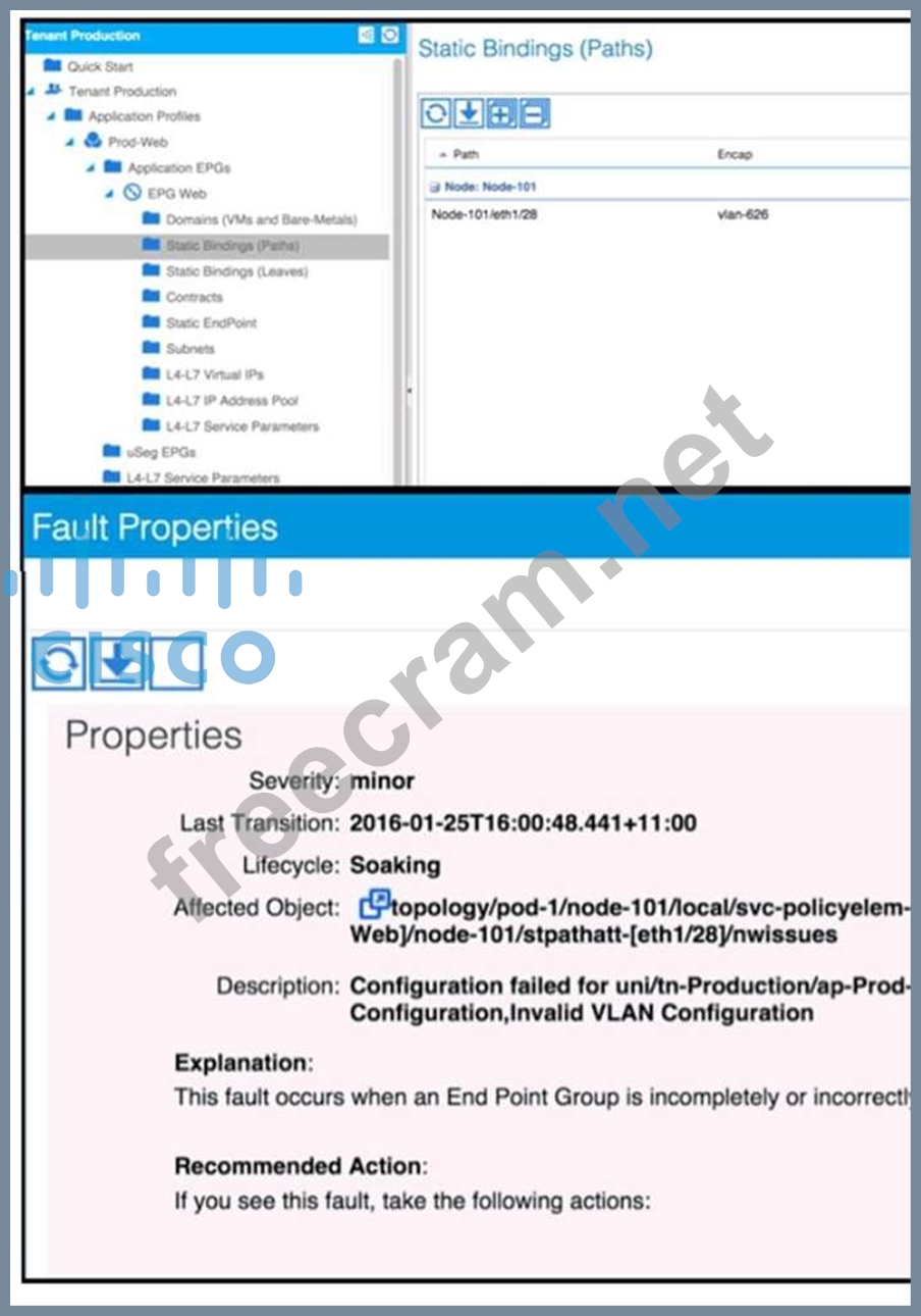 An admin has created a new EPG in an ACI fabric. The admin then specified static path binding as shown in exhibit. After submitting this policy configuration, the admin noticed that this newly created EPG had the fault shown in the exhibit. Which option is the likely explanation of this fault?