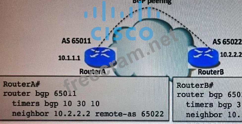 Refer to the exhibit. After the BGP TCP negotiation between RouterA and RouterB, what will be the value of the keep alive timer and the hold-down timer, respectively?