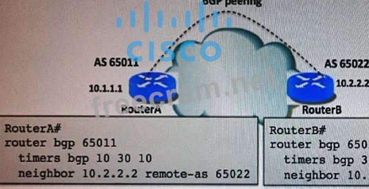 Refer to the exhibit. After the BGP TCP negotiation between RouterA and RouterB, what will be the value of the keep alive timer and the hold-down timer, respectively?