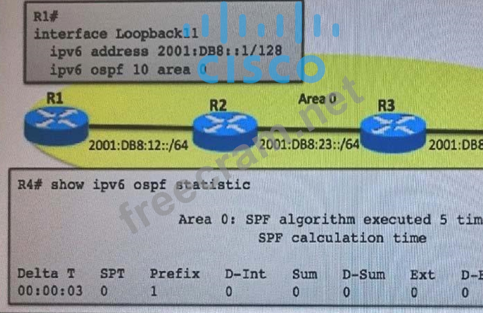 Refer to the exhibit. OSPFv3 is already running, and R1 has added a new subnet (loopback 11). What is the reason code on R4 when executing the command show ipv6 ospf statistics?