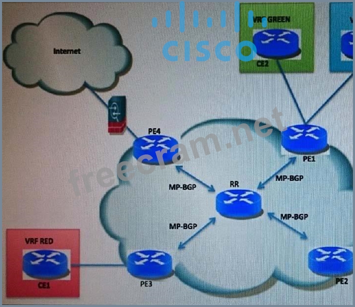 Refer to the exhibit. The Service Provider is deploying Internet service to its VRF customers by using vrf INTERNET. A dedicated firewall provides NAT functionally towards the Internet. Assume that IP address overlapping between VRFs is not an issue.