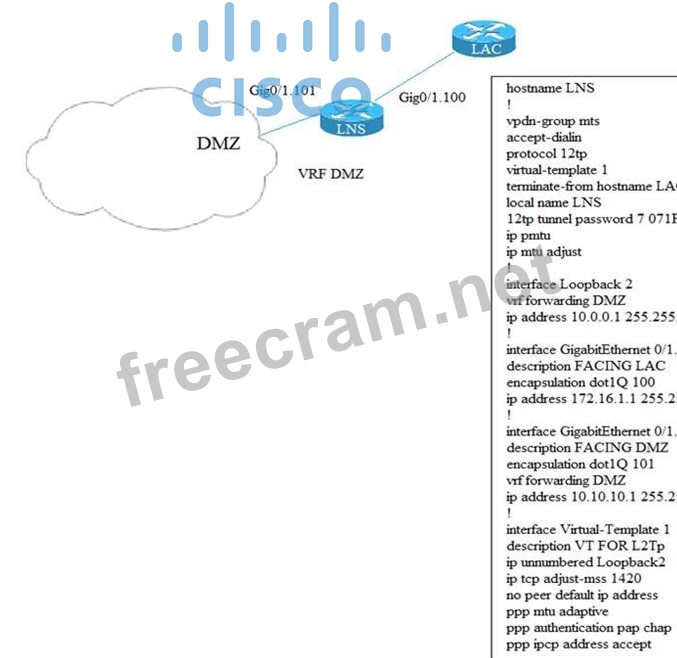 Refer to the exhibit. Test Inc. is troubleshooting a routing issue from the LAC to the inside network. Which solution should you configure on the LNS to correct the issue?