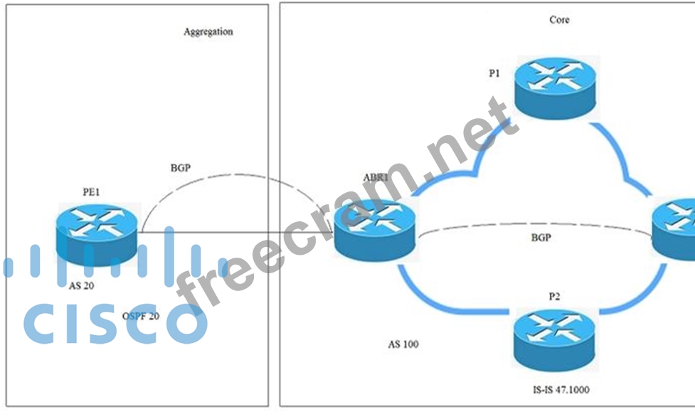 Refer to the exhibit. Which two actions must be applied to provide a seamless MPLS solution that integrates aggregation and core areas of the network by providing scalable end-to-end LSPs? (Choose two.)