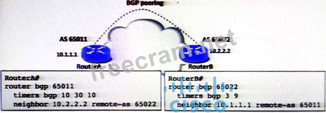 Refer to the exhibit. After the BGP TCP negotiation between Router A and Router B, what will be the value of the keepalive timer and the hold-down timer, respectively?