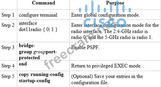To enable and disable PSPF using CLI commands on the wireless device, you use bridge groups. You can find a detailed explanation of bridge groups and instructions for implementing them in this document: