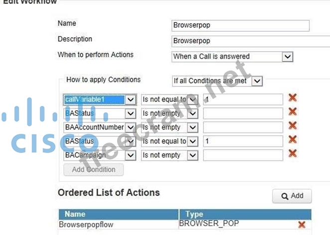 Refer to the exhibit. In Cisco Finesse 10.0 and beyond, a workflow is created for an Outbound Option call. Which condition must be added to ensure that the workflow can distinguish between the Outbound Option call and an agent-initiated outbound call?