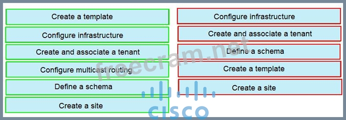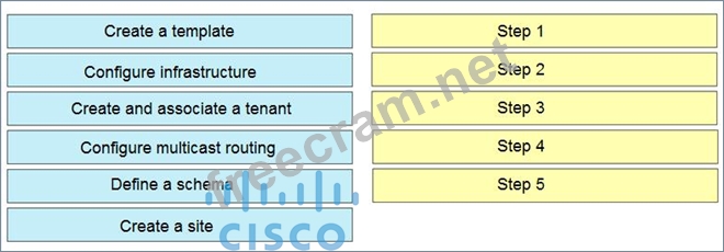 An engineer deploys a Cisco ACI Multi-Site Orchestrator for the first time. Drag and drop the actions from the left into the steps on the right to add a site and deploy new Cisco ACI objects to the fabric. Not all actions are used.