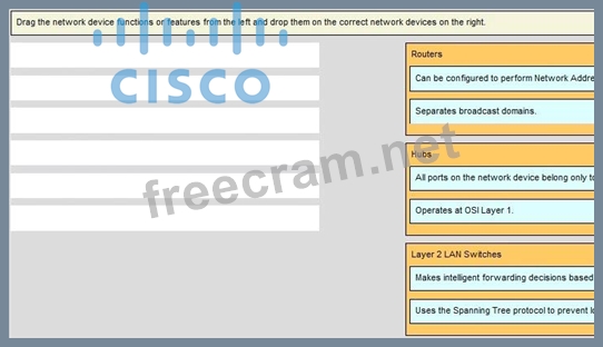 Drag the network device functions or features from the left and drop them on the correct network devices on the right.