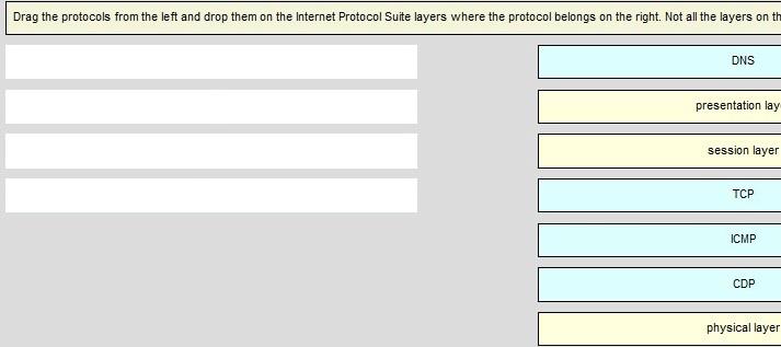 Drag the protocols from the left and drop them on the Internet Protocol Suite layers where the protocol belongs on the right. Not all the layers on the right are used.