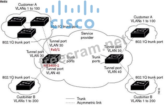 Refer to the topology diagram in the exhibit. Which two interface configuration commands on the Cisco ME 3400-1 switch Fa 0/1 interface are required to support the VLANs for Customer A to be trunked across the service provider network? (Choose two.)
