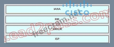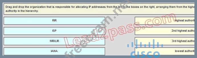 Drag and Drop the organization that is responsible for allocating IP addresses from the left to the boxes on the right. Arranging them from the highest to the lowest ranking authority in the hierarchy.