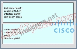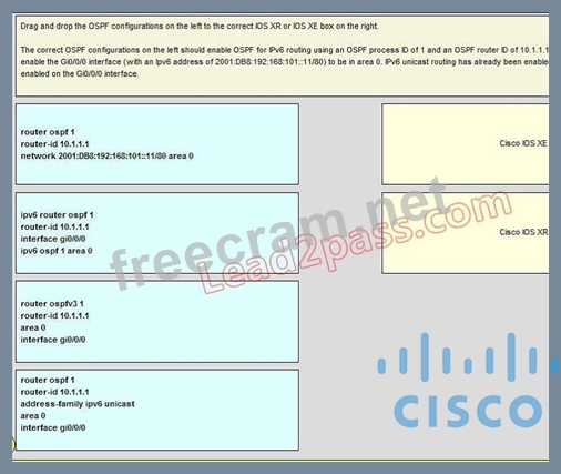 Drag and Drop the OSPF configurations on the left to the correct IOS XR or IOS XE box on the right.