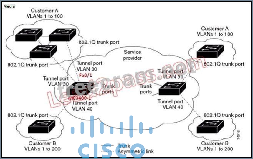 3400-1 switch Fa 0/1 interface are required to support the VLANs for Customer A to be trunked across the service provider network? (Choose two.)