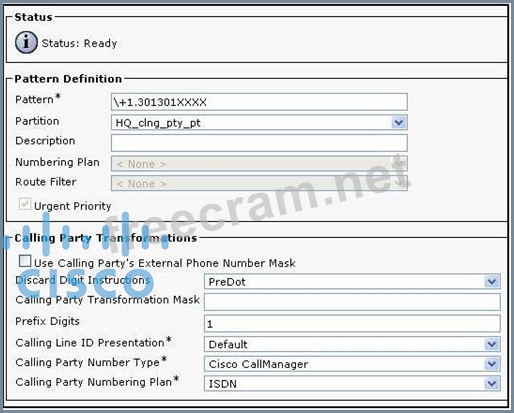 There is a translation pattern that prefixes +1 to the calling number 3013013001. Assume the gateway is configured with a calling party transformation CSS that contains the HQ_clng_pty_pt partition. When 3013013001 places a call to the PSTN, what is the caller ID as it egresses the gateway.