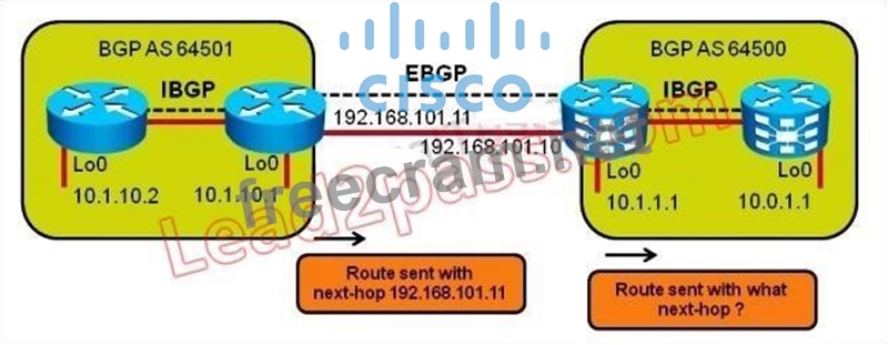 Refer to the network diagram in the exhibit. Assuming the IBGP session within AS 64500 was established using the loopback 0 interface between the two routers, by default, what will be the next hop of the routes from AS 64501 when the routes appear on the router running IBGP only in