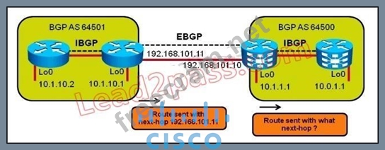 Refer to the network diagram in the exhibit. Assuming the IBGP session within AS 64500 was established using the loopback 0 interface between the two routers, by default, what will be the next hop of the routes from AS 64501 when the routes appear on the router running IBGP only in AS 64500?