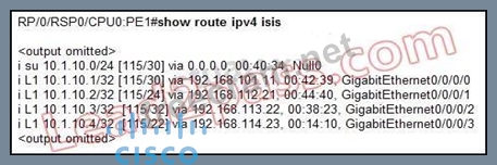 Refer to the PE1 router routing table output exhibit. What is causing the i su 10.1.10.0/24 [115/30] via