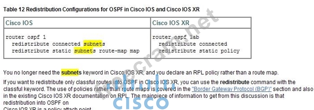 When redistributing routes into OSPF, which kind of routes will be redistributed by default on Cisco IOS XR Software but will not be automatically redistributed by default on Cisco IOS Software and Cisco IOS XE Software?