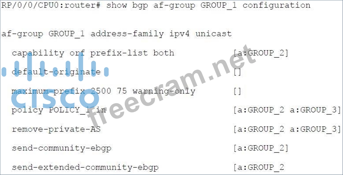 The following example displays sample output from the show bgp af-group command using the configuration keyword. This example shows where each configuration item was inherited from. The default-originate command was configured directly on this address family group (indicated by [ ]). The remove-private-as command was inherited from address family group GROUP_2, which in turn inherited from address family group GROUP_3: