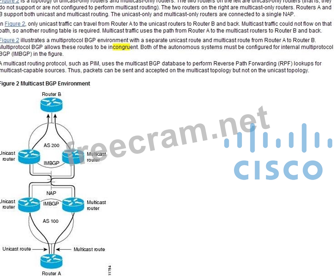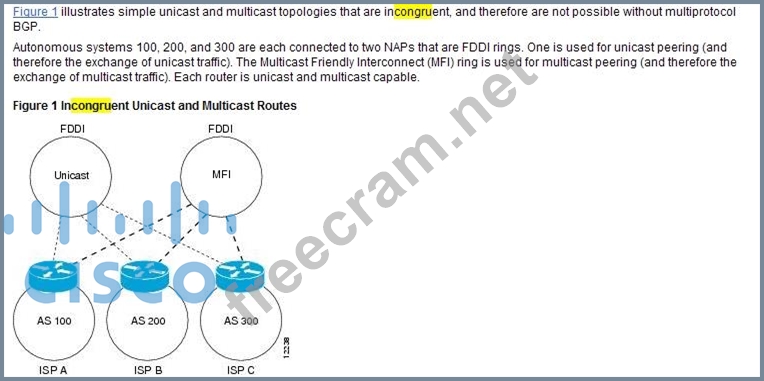 In BGP, the only way to perform interdomain multicast routing was to use the BGP infrastructure that was in place for unicast routing. Perhaps you want all multicast traffic exchanged at one network access point (NAP). If those routers were not multicast capable, or there were differing policies for which you wanted multicast traffic to flow, multicast routing could not be supported without multiprotocol BGP.