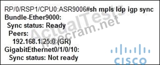 Referring to the Cisco IOS XR show command output exhibit, what are three possible reasons that the GigabitEthernet0/1/0/10 LDP IGP sync status is not ready? (Choose three.)