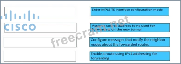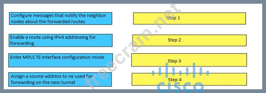 You create an MPLS TE tunnel in IOS XR Software and want to configure forwarding on the tunnel. Drag the steps on the left to their correct order on the right.