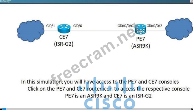 Referring to the network topology diagram shown in the exhibit, use the proper CLI commands on the CE7 and PE7 routers and interpret the supported CLI commands outputs to answer the four multiple choice questions.