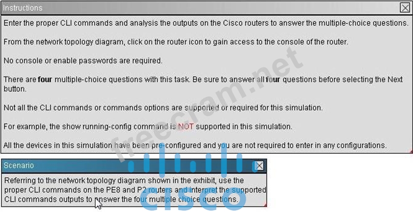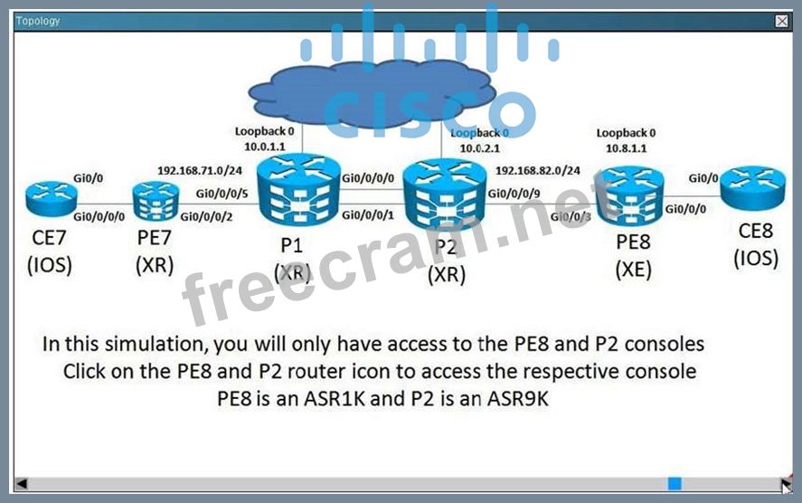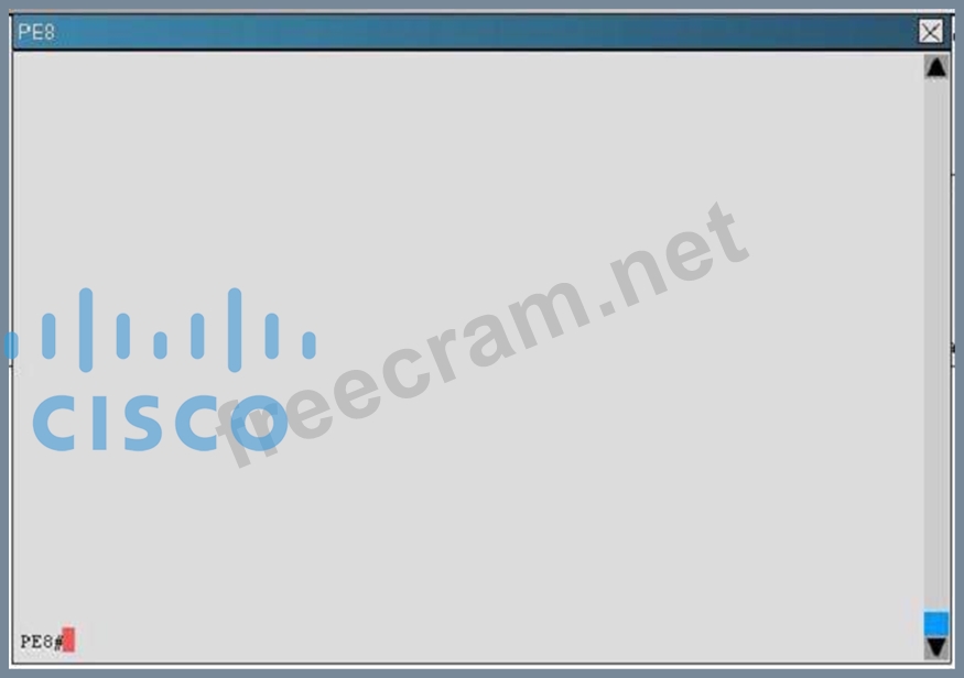 Explanation/Reference: show mpls forwarding-table , find prefix 10.0.2.1 and you will see there under outgoing Label "Pop Label" (This is actually logic because the prefix is directly connected and therefore the packet will forward without label). If the router should forward any packet to that prefix, the packet should be received with Local label on PE8 (Local Label = 35), the router will remove it and forward it without Label.