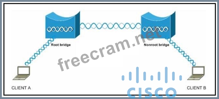 This setup uses two Cisco APs as wireless bridges. One bridge is configured for root bridge mode and the other is configured for non-root bridge mode. Client A associates with the root bridge and Client B associates with the non-root bridge. Which three statements are true? (Choose three.)