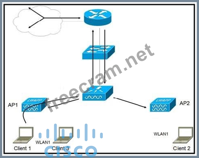 You have just configured multicast on the wired network and the controller. You configured the multicast address on the Cisco WLC to be 239.0.1.25, with IGMP snooping disabled. Clients 1 and 3 are associated to AP1, and Client 2 is associated to AP2. All three clients are associated and authenticated to WLAN 1.