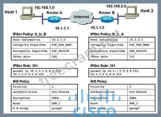 The tables contain information from the Cisco Router and Security Device Manager configurations of Router A and Router B Traffic between Host 1 and Host 2 is not successfully establishing the site-to-site VPN between Router A and Router B.