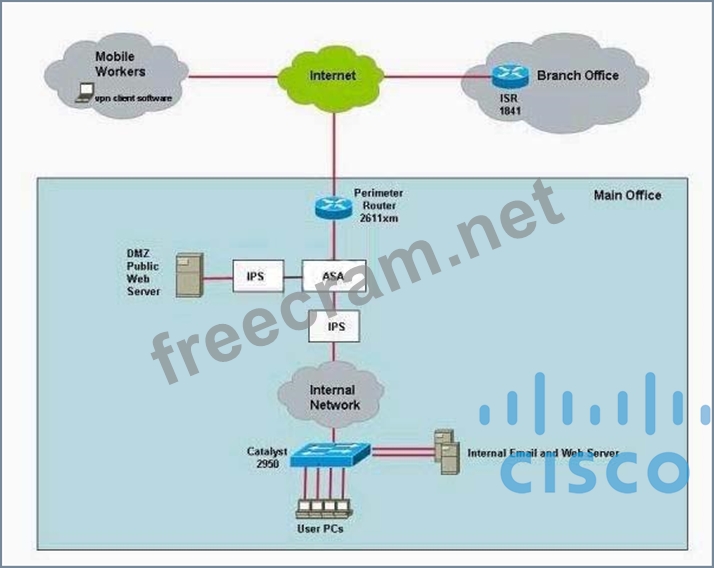Refer to the exhibit. You are asked to implement a network design that consists of two sites, the main office and one branch office connected via the Internet. Communications between these sites must be secure. The main office site also supports 30 local users and 15 remote mobile workers. Before gaining access to the internal network, both the local users and the mobile workers should be authenticated using a scalable solution. Before you begin the implementation, you need to identify which security component is missing in the design.