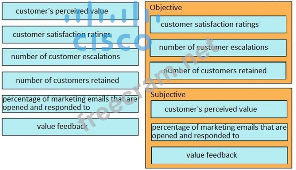 The Customer Success Manager is preparing for a review meeting. The customer has asked for a balance between subjective and objective metrics. Drag and drop the inputs from the left onto the correct subjective and objective categories on the right.