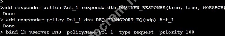 The commands in the screenshot create a responder action and policy that modify the DNS response from the Citrix ADC to the client. The responder action uses the DNS.NEW_RESPONSE function, which creates a new DNS response with the specified parameters. The first parameter is true, which means the response will have the TC (truncated) bit set. The second parameter is true, which means the response will have the AA (authoritative answer) bit set. The third parameter is NOERROR, which means the response will have the rcode (response code) set to NOERROR. The responder policy matches the DNS requests that use UDP as the transport protocol and applies the responder action to them. Therefore, the effect of this configuration is to create a DNS response with TC bit set and rcode as NOERROR for UDP requests. This can be used to prevent DNS amplification attacks by limiting the size of the DNS response.