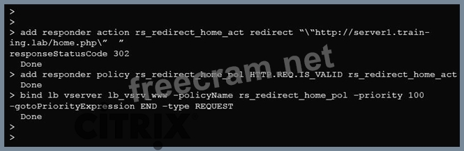 Scenario: A Citrix Administrator configured the Responder policy to redirect the request for root page to the home page.