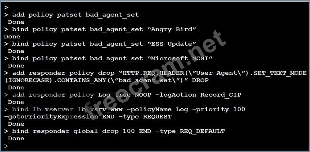 Scenario: A Citrix Administrator used the commands in the screenshot to apply the user-agent check to all the vServers. However, the administrator observed that it is NOT being applied to the vServer lb_vsrv_www.