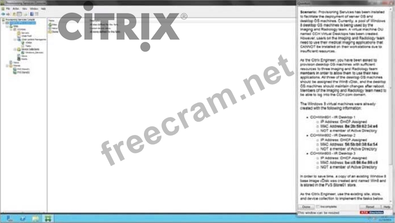 As the Citrix Engineer, you have been asked to provision desktop OS machines with sufficient resources to three Imaging and Radiology team members in order to allow them to use their new applications. All three of the desktop OS machines should be assigned the Win8 vDisk, and the desktop OS machines should maintain changes after reboot. Members of the Imaging and Radiology team need to be able to log into the CCH.com domain.