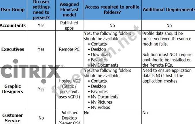 Scenario: A Citrix Architect needs to design a new XenApp and XenDesktop environment. The architect has identified the Resource Layer requirements shown in the Exhibit. Click the Exhibit button to view the requirements. Which feature of Citrix Profile Management could help the architect address the Graphic Designers group requirements?